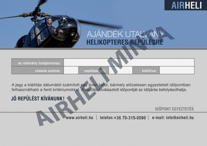 Lepje meg szeretteit helikopteres sétarepüléssel! Ajándékozzon helikopteres sétarepülés utalványt, hogy ismerőseinek egy feledhetetlen élményben legyen részük.